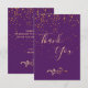 Um fundo roxo e uma chuva de confetes dourados. Na frente, um estilo de letra moderna e o texto: Obrigado e um enfeite floral em dourado.