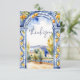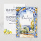 Arco de azulejos maiolica azuis italianos com limões cartão de agradecimento chá de panela, arco de azulejos azuis aquarela e cítricos com paisagem italiana ao fundo, tema de cores azul escuro, branco e amarelo.