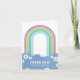 Agradeça aos convidados por terem comparecido à festa de aniversário do seu filho com este cartão de agradecimento temático retrô. O design apresenta um arco-íris colorido e nuvens, com algumas margaridas ao redor da saudação. O interior do cartão tem espaço para uma foto e mensagem personalizada, enquanto a parte de trás do cartão apresenta um padrão diagonal em cores coordenadas.