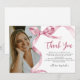 Agradeça aos convidados da sua festa de graduação com nossos cartões de agradecimento de graduação chiques e modernos. Com um laço de fita rosa em aquarela sofisticado e sua foto favorita, esses cartões de agradecimento mesclam estilo e elegância de forma eloquente. Nossa funcionalidade de personalização fácil de usar torna um prazer convidar seus entes queridos.