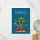 Cartões de agradecimentos com uma imagem de feriado sazonal. Uma palmeira tropical decorada em luzes festivas com uma estrela no topo. Uma bengala branca e vermelha gigante que sai da areia. Presentes de Natal debaixo da árvore. Whimsical e divertido.