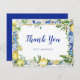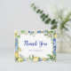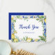 Uma bela nota de agradecimento que apresenta uma borda azul de azulejo mosaico com uma fina estrutura de ouro no centro. Os limões, as flores brancas e as folhas verdes de sábado são entrelaçados para criar uma vibração botânica moderna. Obrigado, está escrito numa bonito caligrafia moderna. Seu nome está abaixo em um texto elegante.