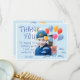 Balões de Urso de Pelúcia Festa de Aniversário Infantil Foto Cartão de agradecimento. Desenho fofo de um urso de pelúcia com balões coloridos e nuvens em fundo azul. A foto está por trás do desenho e do texto. Adicione sua foto, texto e nome.