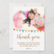Cartão de agradecimento de bandeira de bunting fofo para festa de aniversário da sua menina ou menino. Agradeça aos seus convidados por comparecerem à festa de aniversário do seu filho! O design tem bandeiras de festa de aniversário coloridas em verde, azul e vermelho e uma foto - insira a foto do seu filho no modelo. O texto está na fonte de letra da moda - mude a mensagem de agradecimento se quiser e o nome da criança.
