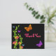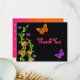 Este cartão de agradecimento de estilo plano selvagem e funky tem vinhas e borboletas florais em verde neon, laranja, rosa, roxo, amarelo e azul que combina com o convite de Bat Mitzvah mostrado abaixo. Se você precisar de outros itens de design correspondentes, envie um e-mail para niteowlstudio@gmail.com.