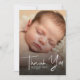 Expresse a sua gratidão com este cartões de agradecimentos moderno, que apresenta a foto do seu bebê e o texto elegante do roteiro branco mostrando seu nome na frente. O design limpo e contemporâneo acrescenta um toque pessoal, fazer uma maneira significativa para a família e amigos obrigados por celebrarem o Batismo do seu bebê ou o aniversário. Personalize as costas com uma mensagem sincera para mostrar seu apreço.