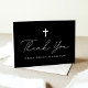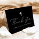 Cartões de agradecimentos batismo simples e elegante com cruz na frente, com "Obrigado" exibido em um roteiro casual de caligrafia branca com fundo preto. Personalize a frente do cartões de agradecimentos de Batismo preto e branco com o nome do seu filho. A dentro do cartões de agradecimentos dobrado exibe uma foto horizontal com a mensagem mostrada abaixo. Este design funciona como excelente para o Batismo Menino ou Menino.