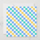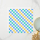 A colorful checkered pattern with alternating blue, green, and yellow squares on a white background. The design is vibrant and geometric, creating a playful tone.