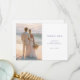 This is a romantic style image featuring a couple standing on the beach, gazing at the sunset. The groom wears a light-colored suit while the bride holds a bouquet of soft pink and white flowers in her flowing dress. The warm hues of the setting sun cast a golden glow over the scene, creating an intimate and serene mood. Perfect for expressing gratitude to guests after a beautiful wedding day, this card captures the essence of love and tranquility.
