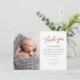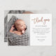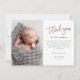Esta foto moderna, graças a você, apresenta rosa gold, um obrigado de script manuscrito, mensagem pessoal e uma foto vertical na frente. O verso inclui uma segunda foto de bebê que é uma foto horizontal de cheio.