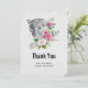 Cartão de agradecimento com uma bela ilustração apresentando um retrato de leopardo cinza, preto e branco. Este adorável animal é cercado por um buquê de flores tropicais. Elegante, exótico e adorável.