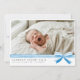 This baby boy birth announcement card features a sweet newborn photo accented with a soft blue ribbon bow and delicate stripe detail. The clean layout highlights your baby’s name and birth details while keeping the focus on the photo. A timeless design that feels classic yet fresh, perfect for sharing the happy news with family and friends. The back includes space for a photo and a heartfelt thank you message from the parents.