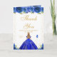 This elegant and glamorous birthday thank you card features a beautiful princess with blonde hair and fair skin in a royal blue ball gown. The text combines handwritten script and modern sans serif fonts for a classy and sophisticated look. The floral arrangements, butterflies and gold confetti create the perfect blend of rustic and chic.