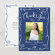 Make sure your favorite grad shows appreciation to all who supported their milestone event! Send out this quirky, playful, simple, modern, personalized photo thank you card. On the front, fun white handwritten script typography and hand drawn graduation icon sketch doodles, along with your custom photo, overlay a navy blue background. Add the photo of your choice and personalize the custom text with your grad’s name, and class year. On the back, type in your custom message or delete the copy altogether so you can write your own handwritten note. Matching invites, address labels, banners, stickers, hand fans and other graduation goodies are also available in this trendy and stylish collection. Guaranteed to add a stylish touch to their correspondence!