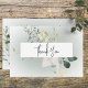 Este design de cartões de agradecimentos de casamento apresenta um buquê simples e flexível de cima e solto de verde botânico com um arco branco sobre um fundo branco e verde suave de cor oval e branco. É delicado e elegante. Criada pela "Simply Farmhouse Press", faz parte da suíte de cartas Boho Delicate Greenery Modern Floral Wedding.