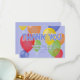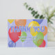 Este cartão de agradecimento de aniversário divertido e colorido apresenta a mensagem "obrigado" escrita de forma realista e caprichosa, com bolinhos com glacê azul recortados, cercados por balões multicoloridos - a imagem de dois biscoitos recortados em forma de balão acentua a parte de trás do cartão - personalize com sua mensagem na frente - o fundo é personalizável em azul claro - por katz_d_zynes