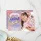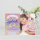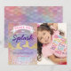 Cartões de agradecimento de aniversário sob o mar com uma foto de seu filho, um fundo colorido com padrão de concha de sereia pastel, brilho dourado e rosa, algas, duas caudas de sereia com brilho dourado e um modelo de agradecimento de festa infantil fofo e fácil de personalizar.
