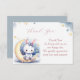 Cartões de agradecimentos super bonito com um belo coelhinho branco vestindo um lindo arco azul sentado em uma lua adorável com estrelas douradas caindo e algumas nuvens azuis empoeiradas.