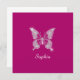 Uma borboleta de diamante branco de classe com nome de script branco em fundo fuchsia profundo.