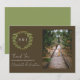 Wedding collection with earth tones of green and dark brown. A gold geometric monogram crest surrounded by botanical leaves. Photo template via Pixabay licensed under CC0 and must be replaced with your own photo.