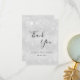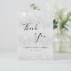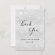 Um cartão de agradecimento para chá de noiva. Uma cor de fundo metálico prateado falso. Com brilho falso. Na frente, uma grande letra manuscrita e o texto: Obrigado, seu texto, título e data.