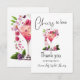Elegantes Flores de Jardim com Taça de Champanhe, Frutas Vermelhas e texto "Brinde ao Amor" Cartão de agradecimento temático floral para chá de noiva em cores lilás, lavanda, rosa bege, pêssego, damasco e verde.