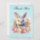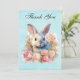 Thank you card with a watercolor image. A white gray bunny rabbit surrounded by a garland of pink and peach roses. For bunny lovers and Easter themes and birthdays and showers.
