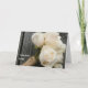 Um cartão de agradecimento com uma foto de um buquê de rosas brancas envoltas em corda de juta apoiado num fundo de madeira de celeiro. O texto na frente diz "Obrigado". Por dentro está em branco. Este cartão também pode ser comprado em tamanho de cartão postal menor. Procure por convites de casamento e mais em Jill's Paperie.