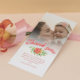 Cartão com fotos batismo personalizado com uma foto sua linda bebê. Obrigado escrito em um belo roteiro de pincel de coral acima de um buquê de rosa em cores quentes e uma mensagem pessoal para seus hóspedes de batismo. A borda entre a foto do casamento e o texto é amolecida com um gradiente branco. Adicione seus nomes também!
