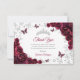 Burgundy silver Quinceanera celebration thank you card. Features, script font, butterflies, watercolor roses and tiara. Perfect for an elegant princess style glam celebration. Personalize with your own details.