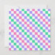 A vibrant checkerboard pattern featuring alternating pastel purple, pink, and green squares against a white background, creating a playful, colorful effect.