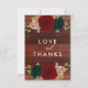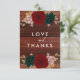 Este elegante e rústico cartões de agradecimentos de casamento apresenta uma rica paleta colorida de burgundy, verde esmeralda e sotaques dourados. A design apresenta um fundo de madeira com uma estrutura geométrica de ouro, adornada com um arranjo floral de rosas vermelhas vibrantes, folhas verdes profundas e delicados sotaques de ouro. As palavras "AMOR e OBRIGADOS" são escritas elegantemente dentro do quadro, completando esse cartões de agradecimentos de coração e na moda.