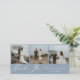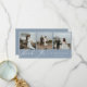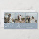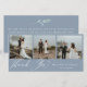 Elegante cartão de agradecimento de casamento em azul empoeirado com várias fotos. O cartão apresenta fundos de cor azul empoeirada sólida, texto de caligrafia branca "Obrigado", sutil destaque de grama pampas em aquarela azul empoeirada no verso e 3 espaços para fotos na frente.