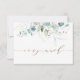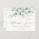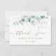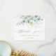 Esse cartões de agradecimentos apresenta cores aquáticas pintadas de eucalipto, verde botânico e folhas de brilho dourado com muito roteiro atrás.
