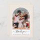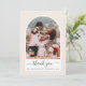 Cartões de agradecimentos de casamento mínimo e elegante para recém-casados apresentando sua foto em um quadro arquitetado contra um fundo creme, "obrigado você" em um roteiro moderno de na moda e seu nome e data de casamento de Sr & Sra em uma simples tipografia. No verso, você pode personalizar um obrigado que você envia e adicionar seus primeiros nomes como uma assinatura.