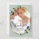 Eucalyptus Dourado Elegante Sage Foto de Cartões de agradecimentos de Casamento... Nosso elegante cartões de agradecimentos de casamento com fotos de eucalipto apresenta uma estrutura oval metálica dourada embelezada com folhas de eucalipto abarrotadas de esmeraldas junto a uma foto da noiva e do noivo em um fundo verde-claro. Sua foto será colocada em uma camada abaixo de uma transparência branca para "esmaecer" as cores na parte inferior, de modo que o texto "Obrigado", a noiva e os nomes de noivos sobrepostos no topo sejam legíveis. A parte traseira do cartão exibe uma mensagem que você pode manter ou revisar para seu obrigado pessoal. Todo texto de exemplo pode ser facilmente revisado com suas próprias informações sobre o modelo de personalização. Parte de uma suíte de casamento com acessórios coordenadores no mesmo tema de ouro de ouro de eucalipto.