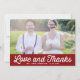 Dê aos seus obrigados um toque divertido e nostálgico com este cartões de agradecimentos de casamento de fotos horizontais personalizadas. Projetado com a ousada e retrógrada tipografia do "amor e obrigados" sobre sua foto favorita de casamento, este cartão combina o encanto da vintagem com a personalização moderna. Adicione sua foto, seus nomes e uma mensagem personalizada para criar um na moda e um obrigado memorável para seus convidados. O layout horizontal oferece uma sensação limpa e contemporânea ao mesmo tempo que destaca seu momento especial. Perfeito para casamentos ou casais com temas antigos que amam uma estética lúdica e retrorreflectora, este cartão facilita compartilhar sua apreciação de uma forma que se sente pessoal e única.