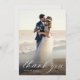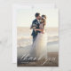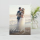 Um cartão com fotos moderno com caligrafia branca e um obrigado personalizado que você envia aos seus convidados.