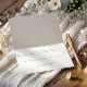 Espessura de 18 pt / Gramatura de 120 lb. Branco suave, textura delicada.