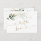 Cartões de agradecimentos elegante com folhagem verde e dourada em estilo aquarela. No topo - esverdeado e confete de efeito ouro. O texto "Com amor" é escrito em uma fonte de script com corações unidos.