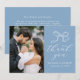 Compartilhe sua gratidão com este elegante cartões de agradecimentos de casamento mostrando sua foto de casamento vertical à esquerda e um arco desenhado à mão com "Obrigado" em caligrafia branca na moda à direita contra um fundo azul macio. Personalize com seus nomes e data de casamento para criar uma manutenção de eterno. A parte de trás do cartão oferece espaço para o seu obrigado pessoal que você envia, fazer que seja fácil expressar um verdadeiro apreço aos entes queridos. A paleta branca e azul suave é perfeita para casamentos modernos, românticos ou costeiros.