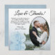 Estes belos cartões de agradecimento de casamento são uma maneira maravilhosa de mostrar seu apreço aos seus amigos e família por celebrar com você no seu dia especial. Eles apresentam a sua foto de casamento em uma moldura oval com um solteiro longo e pálido, azul ou azul-pálido, deitado do lado dele refletindo na água. O título diz "Obrigados e amor" com espaço para uma nota e assinatura personalizadas. Clássico, romântico e sofisticado, estas cartas são a forma perfeita de concluir a sua celebração de casamento.