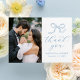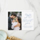 Envie uma apreciação sincera com este cartões de agradecimentos de casamento na moda com sua foto de casamento vertical à esquerda e um arco azul suave desenhado à mão com "Obrigado" em uma caligrafia azul graciosa à direita contra um fundo branco. Personalize com seus nomes e data de casamento para uma manutenção significativa. A parte de trás da carta inclui espaço para o seu obrigado, que envia uma mensagem, ajudando-o a partilhar uma gratidão sincera com a família e os amigos. Os sotaques suaves e azuis fazem desta design uma escolha adorável para temas de casamento costeiros, primavera ou românticos.
