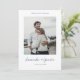 Este obrigado de casamento de fotos simples e na moda, seu modelo de carta lisa apresenta seus nomes em um roteiro de escrita manual vivo sob sua foto. A forma padrão é um estilo de canto agudo padrão, mas este design também parece excelente com cantos arredondados, então tente ambos os modos de edição para ver qual é o seu nível! A cor de texto padrão em ambos os lados é uma elegante sombra escura e média de azul. Você pode optar por alterar a fonte, a pontuação ou a cor usada para vários elementos de texto deste design na frente e/ou no verso. Por exemplo, você pode mudar o texto LOVE AND OBRIGADOS acima da foto para OBRIGADO OU algo diferente, ou pode mudar o texto para outra sombra de azul ou outra cor inteiramente. O plano de fundo na frente é definido como transparente para permitir que a cor do papel sirva simplesmente como o tom base, mas você pode mudar esta aparência escolhendo uma cor para o plano de fundo. Na parte de trás, escolhemos uma matiz de fundo que não é bem branca, é uma cinza muito clara chamada Fumaça Branca. Você pode alterar isso selecionando outra cor nas ferramentas de edição. E escolhemos a mesma sombra de cinzas que escolhemos para a data na frente como a cor padrão para o texto no verso. Nós colocamos alguns exemplos de texto nas costas para você substituir por sua própria mensagem enquanto você vê ajustado, mas por favor não se sinta restrito por isso. Se você preferir excluir nosso texto de amostra completamente e manter a parte de trás totalmente vazio para que você possa escrever uma nota manuscrita em cada cartão, você pode fazer isso. Ou talvez você queira substituir nosso texto por sua própria mensagem de gratidão e seu próprio fechamento e então assinar seus nomes quando você receber os cartões. Você também pode mudar a fonte e pode mudar o caso da aparência de todas as maiúsculas que adicionamos. O tipo de papel padrão, matte, tem um calor suave e resiste a manobras, então é uma escolha excelente para escrevendo sua própria mensagem. Em vez disso, você pode editar isso e escolher semirdano ou outro tipo de papel. Em qualquer caso, não se esqueça de excluir nosso texto de amostra/espaço reservado em ambos os lados da placa e lembre-se de substituir a foto do espaço reservado na frente por sua. Use as ferramentas intuitivas de design, sua foto favorita e sua inspiração e faça com que esse cartões de agradecimentos de casamento chic seja exclusivamente seu. E navegue na nossa obrigado de casamento que você coleciona para designs de cartões de agradecimentos de casamento mais elegantes e modernos!