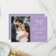 Envie obrigados incríveis com este cartões de agradecimentos chic de casamento mostrando sua foto vertical de casamento à esquerda e um arco desenhado à mão com "Obrigado" em elegante caligrafia branca à direita contra um fundo lavanda. Personalize com seus nomes e data de casamento para uma lembrança duradoura do dia do seu casamento. A parte traseira da placa oferece espaço para a mensagem do seu obrigado, permitindo que você compartilhe uma apreciação genuína com a família e os amigos. A paleta da lavanda faz dessa design uma escolha ideal para casamentos românticos, modernos ou minimalistas.