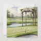 Mostre sua apreciação com este elegante Cartões de agradecimentos de Casamento Golf. Com um pano de fundo de campo de golfe sereno, o cartão inclui um bunker verde, areia e risco de água, com um porto de casamento de madeira enfeitado com belos arranjos florais. As palavras "Obrigado" são delicadamente trabalhadas em cursivo, como se fossem cortadas da erva, acrescentando um toque pessoal e único. Esta carta de cor d'água captura a beleza e a tranquilidade de um casamento no campo de golfe, perfeito para expressar sua gratidão aos convidados.