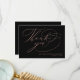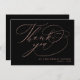 Envie um rosa de ouro e cartões de agradecimentos preto para seus convidados de casamento para obrigado-los. Este design de caligrafia apresenta uma elegante tipografia de guião rosa-ouro, escrita à mão, que lê "Obrigado" juntamente com o seu nome para personalizar. A parte traseira do cartão tem uma mensagem personalizada junto com a sua assinatura. Desenhada por Susan Coffey.