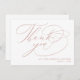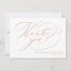 Envie um rosa de ouro e um cartões de agradecimentos branco personalizados para os seus convidados de casamento para os obrigado. Este design de caligrafia apresenta uma elegante tipografia de guião rosa-ouro, escrita à mão, que lê "Obrigado" juntamente com o seu nome para personalizar. A parte traseira do cartão tem uma mensagem personalizada junto com a sua assinatura. Desenhada por Susan Coffey.