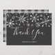 Cartão de agradecimento de casamento com tema de inverno com flocos de neve com glitter prateado. O texto diz "obrigado" em fonte cursiva com os nomes dos recém-casados abaixo. A parte de trás do cartão é xadrez cinza carvão.