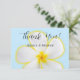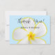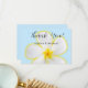 Um design floral suave e delicado com uma flor de Plumeria havaiana branca e amarela em um fundo azul suave. Um conjunto de convites perfeito para casamento na praia, casamento havaiano, casamento em destino de ilha tropical e mais. O significado havaiano para a flor de Plumeria é "novos começos" e "positividade". Ambos perfeitos para os novos começos de um relacionamento casado.